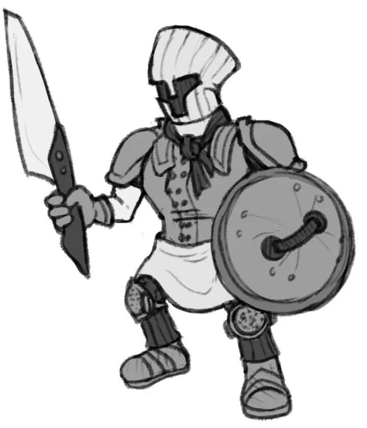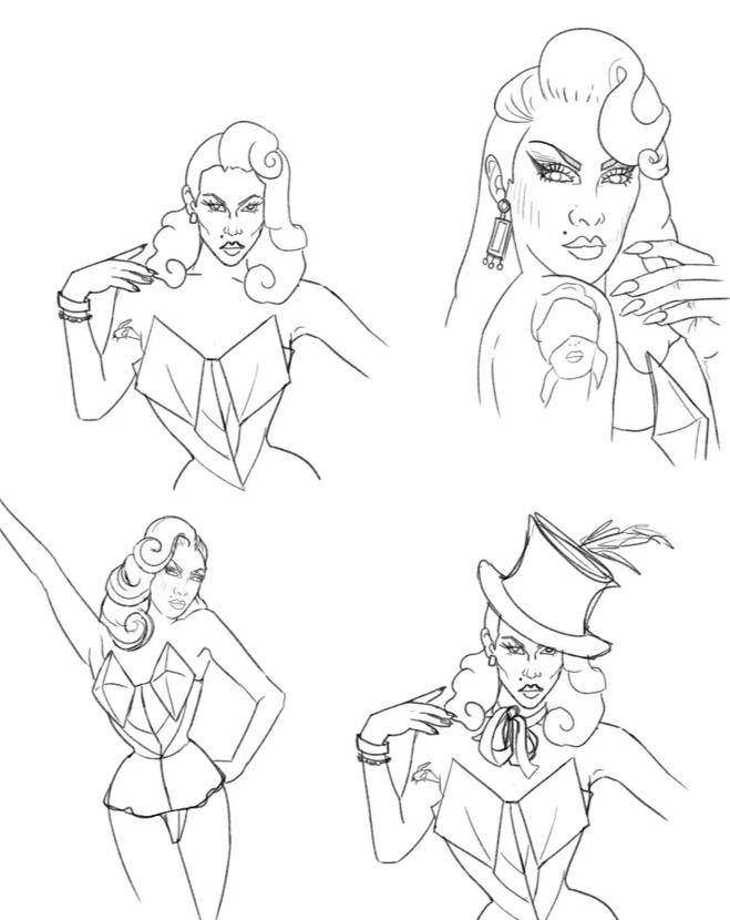 One character, with sketchy line work OR one character with cleaned up lines, greyscale